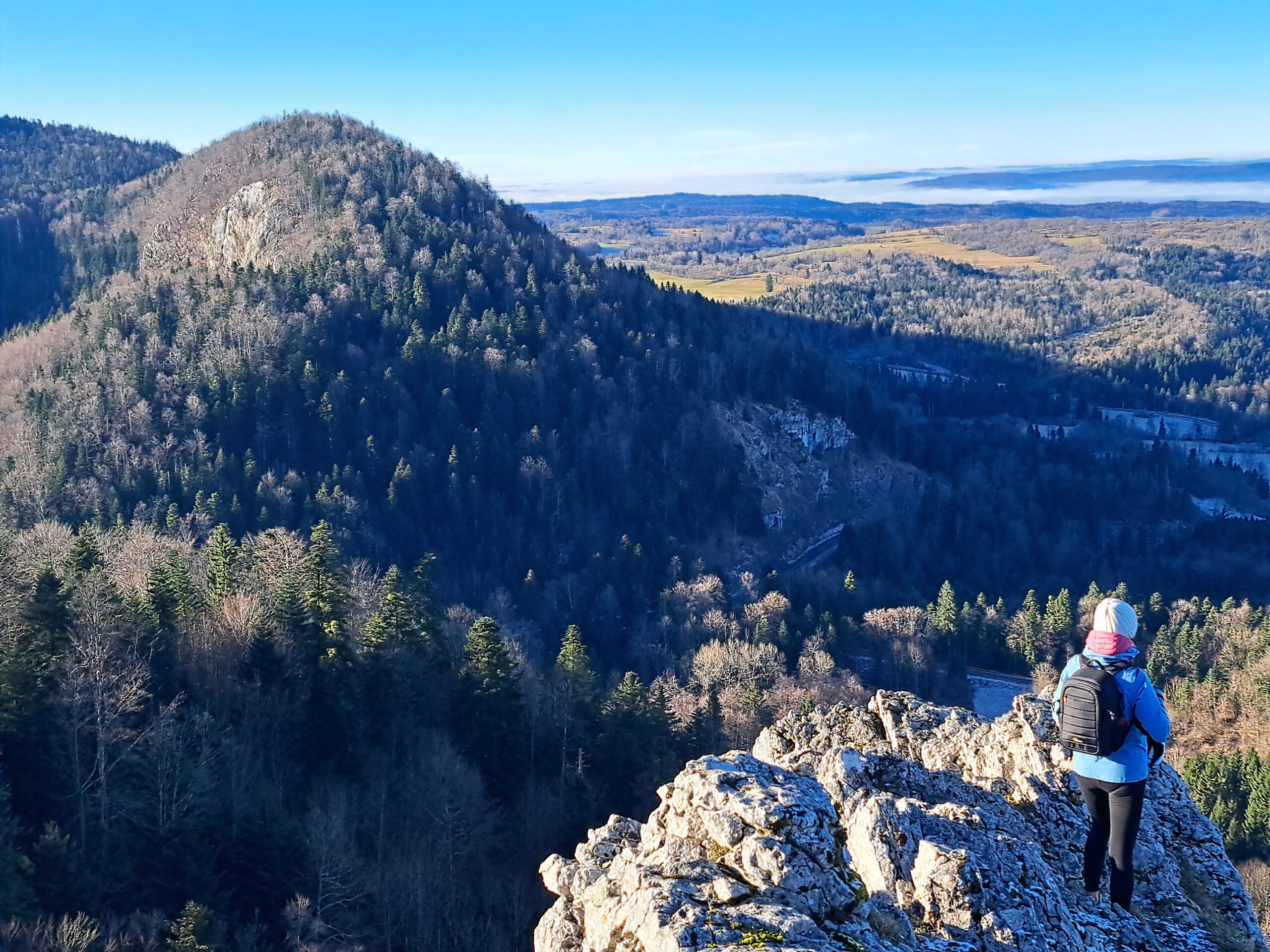 Belvédère des 4 lacs – C’est curieux comme dans le Jura, plus on descend plus il fait froid. Nous n’avons jamais eu aussi chaud qu’au sommet du Pic de l’Aigle!