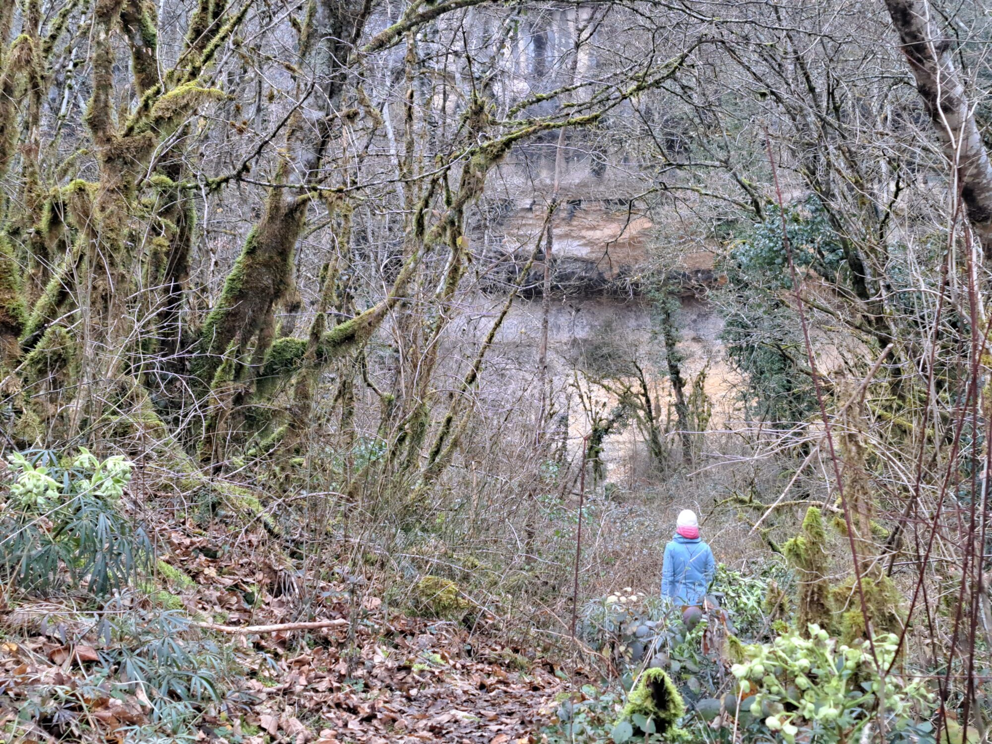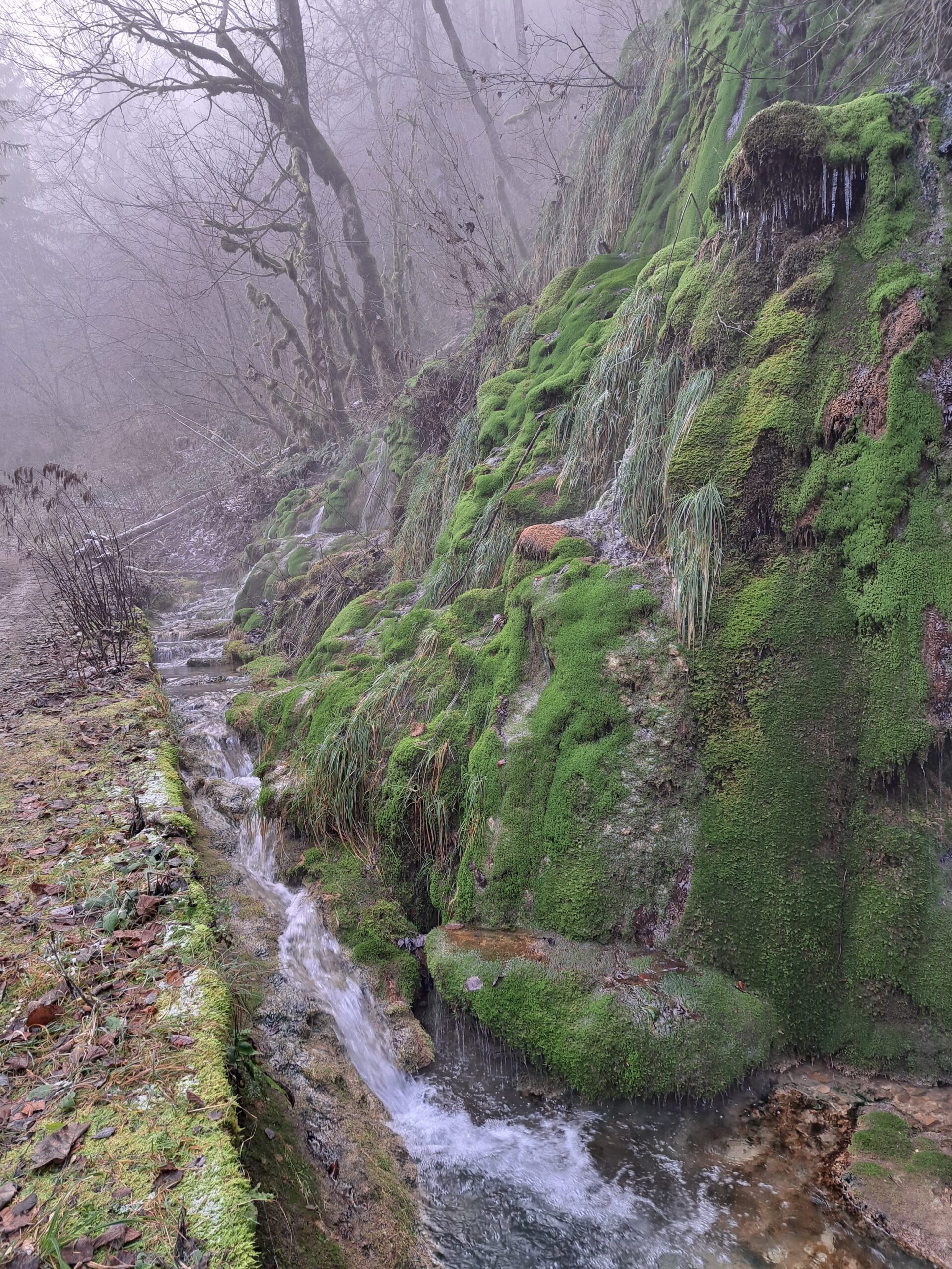 Après une nuit paisible et glaciale dans la brumeuse cité d’Orgelet, nous nous hâtons de découvrir l’exotique cascade des Tuf Marangéa. A ranger dans la famille des cascades tuffières, dont le département n’est pas avare (et dont nous raffolons). C’est là que nous croisons un chasseur affable, lourdement armé, dans son gilet orange, qui nous assure d’emblée: « La nature est à tout le monde. » Nous en tombons d’accord, mais son molosse est-il de cet avis?