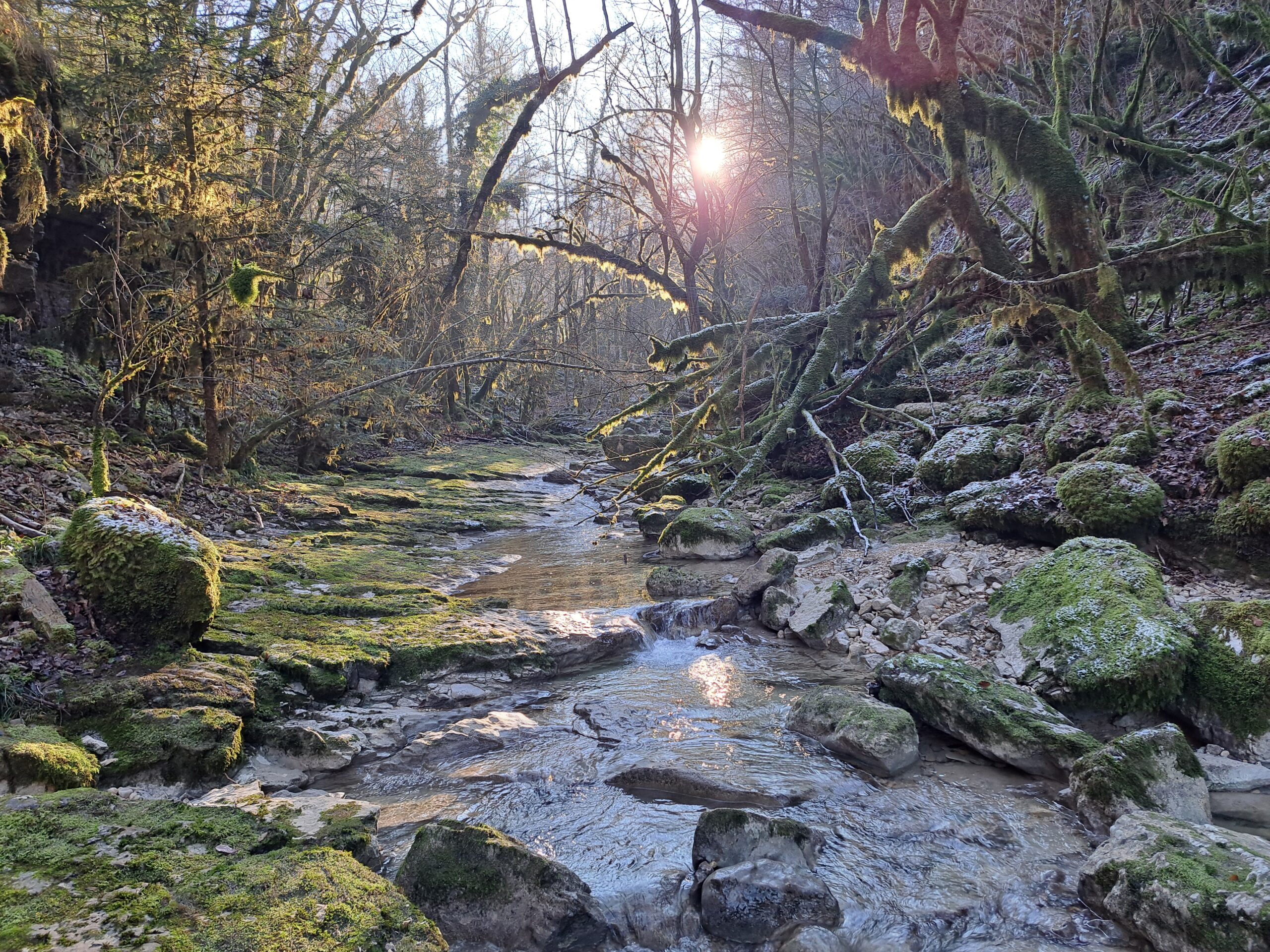 Puis la ballade s’achève sur la jolie cascade du Moulinet, petite célébrité locale. Nous devrons nous habituer aux horaires d’hiver, car la luminosité diminue dès 16h30. D’autant que trouver un lieu où se réchauffer, un 25 décembre, ne sera pas une mince affaire. Ainsi finirons-nous au Kebab de Champagnole, judicieusement nommé l’Escale.