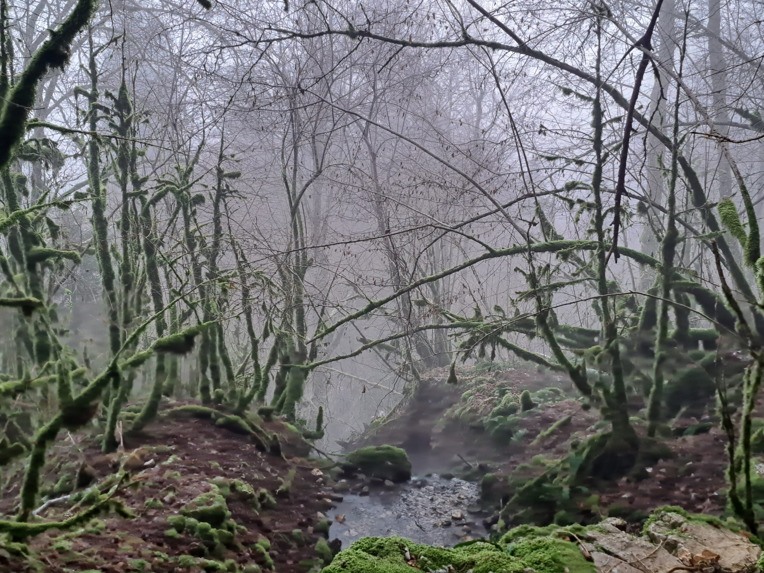 L’endroit dégage un charme puissamment romantique; accentué par la brume. La Quinquenouille, relativement célèbre par rapport aux tas de mousse que nous fréquentons, menace disparition dans une vapeur givrée