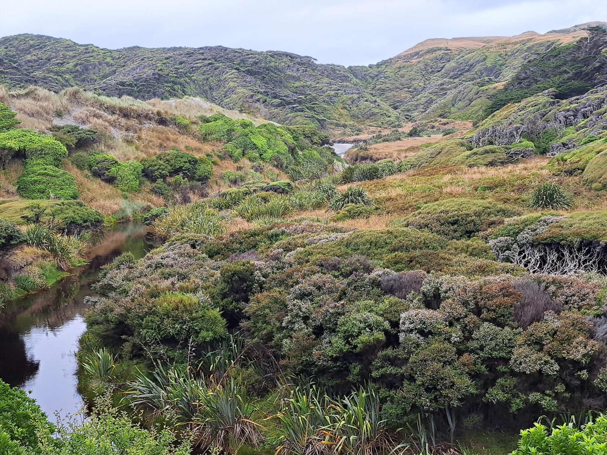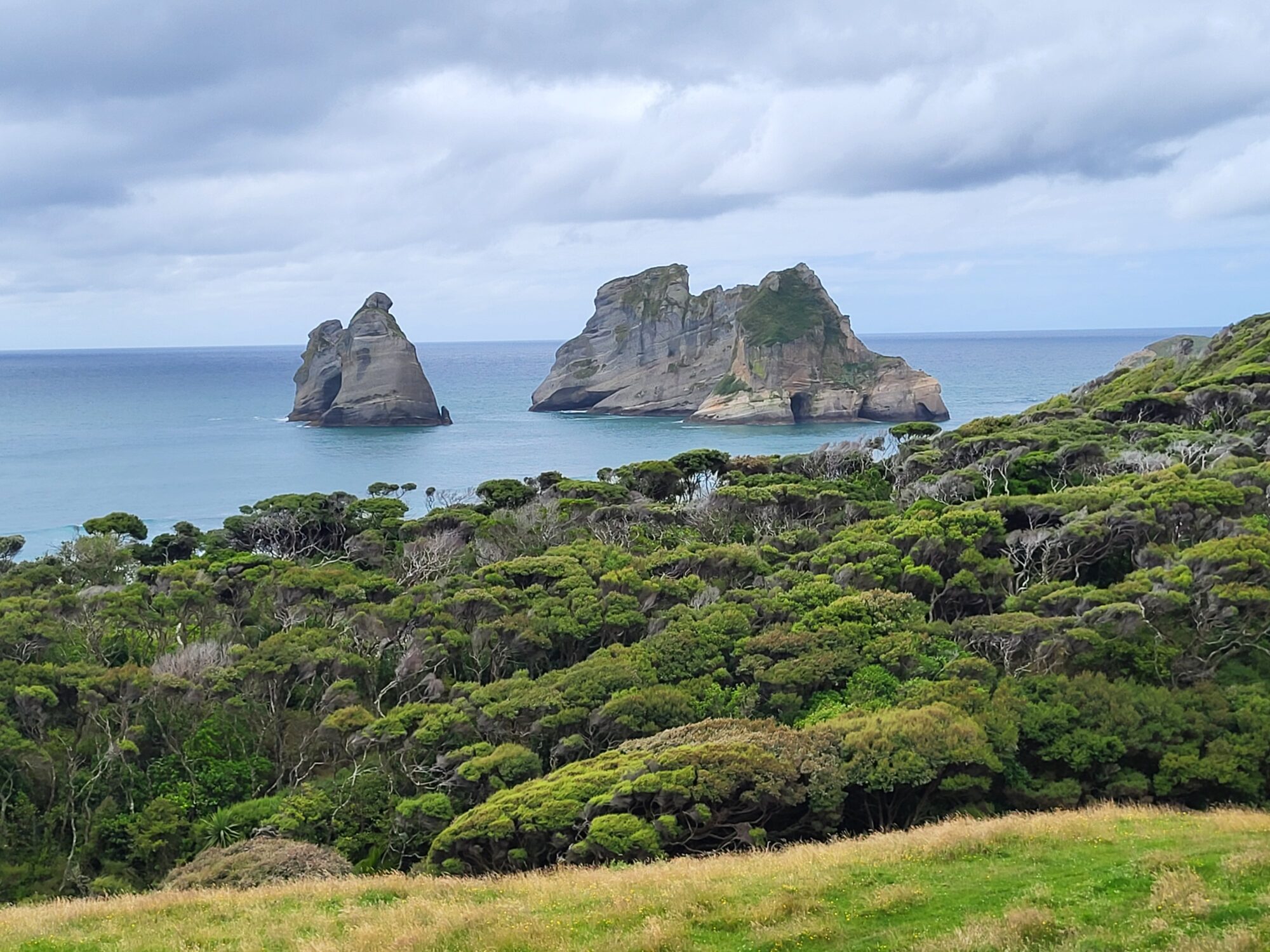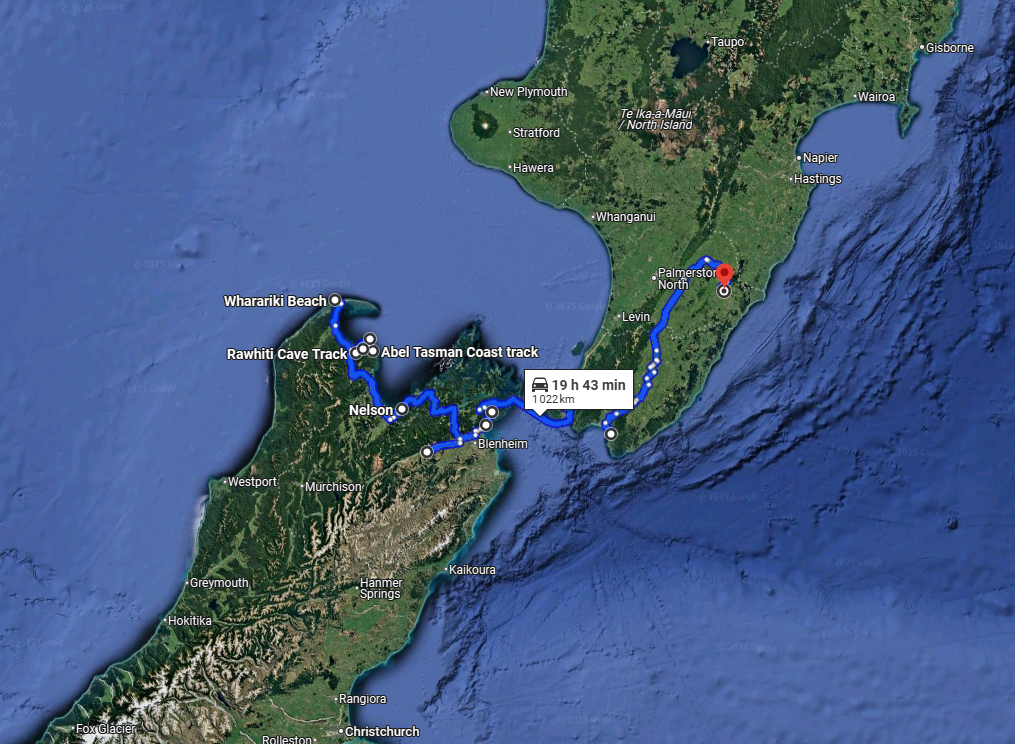 On entend souvent dire que « l’été n’a pas commencé » qu’il « pleut vraiment tout le temps » mais pour ce qui nous concerne, la chance nous sourit. Nos principales randos se sont passées au sec, nous n’avons essuyé ni orage ni tempête. En cas de mauvais temps, nous allons voir ailleurs, dans l’habitacle d’Hunky Dory, voir si l’herbe est plus verte quelques miles plus loin. En l’occurrence, le temps n’est pas fameux à l’entame de cette sixième semaine. Une heure nous sépare du littoral nord, et c’est avec un soupçon de gourmandise que nous abordons les rivages d’Abel Tasman et de l’océan Pacifique.