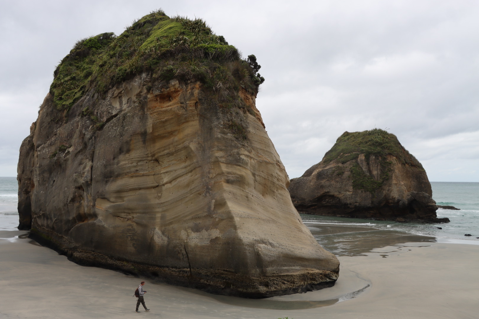 Blague à part, la plage nous a emballé. On a envie d’en profiter à fond. Après le déjeuner, plutôt que de pousser vers l’isthme de Farewell, on s’en retourne voir Ricky, cette fois par le chemin des dunes. Les arches immenses nous impressionnent!